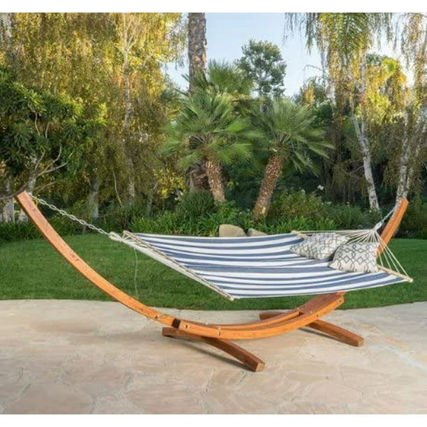 Modern Retro Freestanding Swing Hammock With Larch Wood Frame In Teakwood Finish Navy And White Stripe Walmart Com