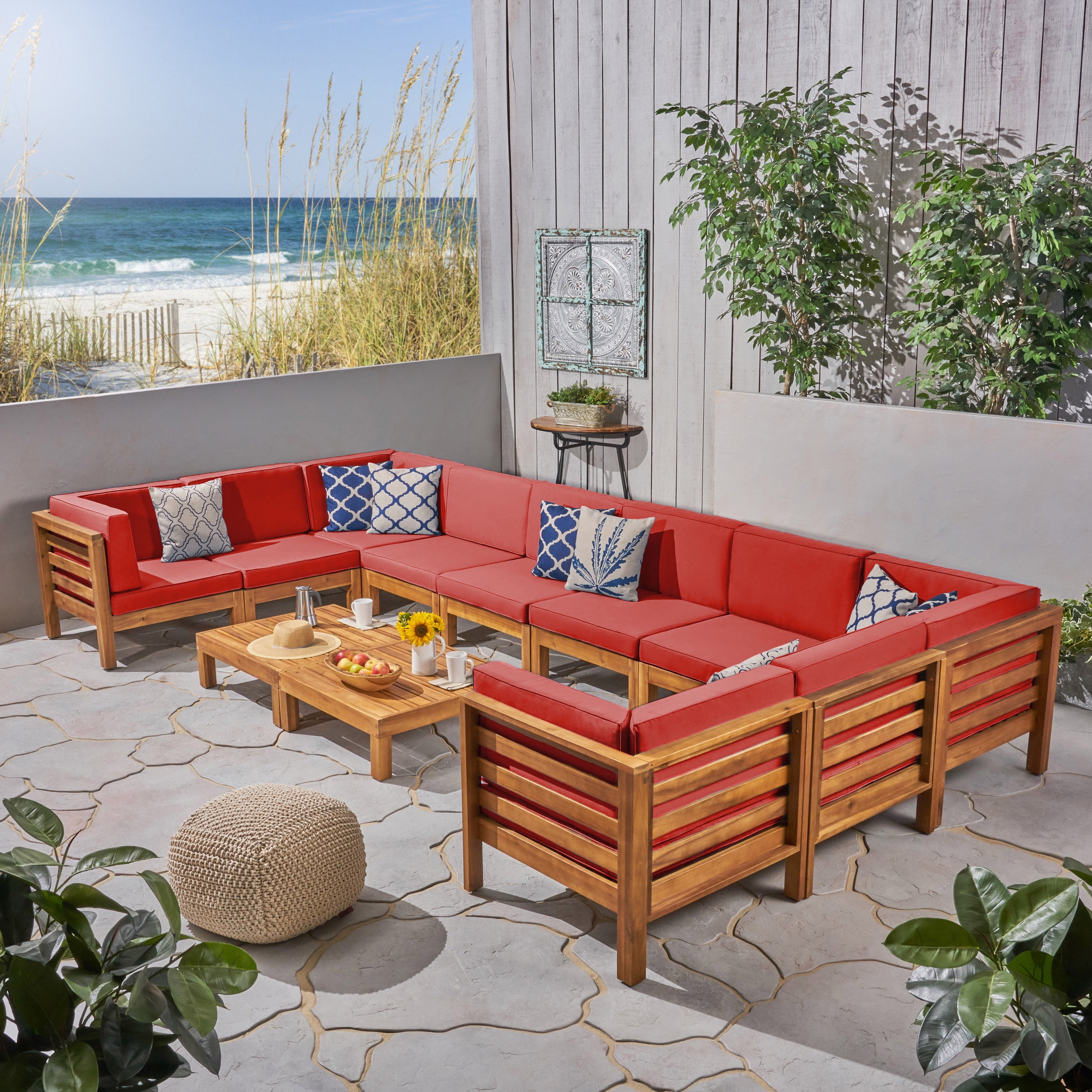 Thea Outdoor 12 Piece Acacia Wood U Shaped Sectional Sofa Set And Cushions With Coffee Tables Teak Red Walmart Com