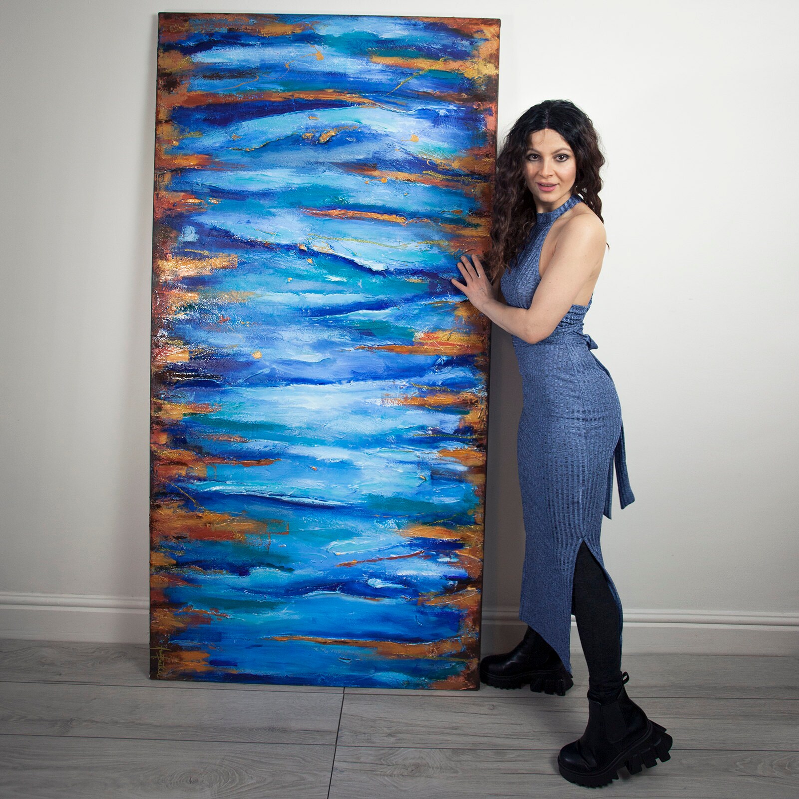 Sunrise Gold Leaf Original Paiting Acrylic Turquoise Water Deep Blue Golden Sun Ocean Painting Christm Ocean Painting Sunrise Painting Blue Abstract Painting